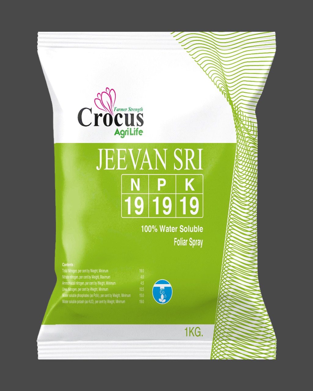 JEEVAN 19:19:19 is a high-quality, fully water-soluble fertilizer formulated to provide a balanced supply of Nitrogen (N), Phosphorus (P), and Potassium (K). It ensures quick nutrient absorption through both leaves and roots when applied via foliar spray or fertigation.